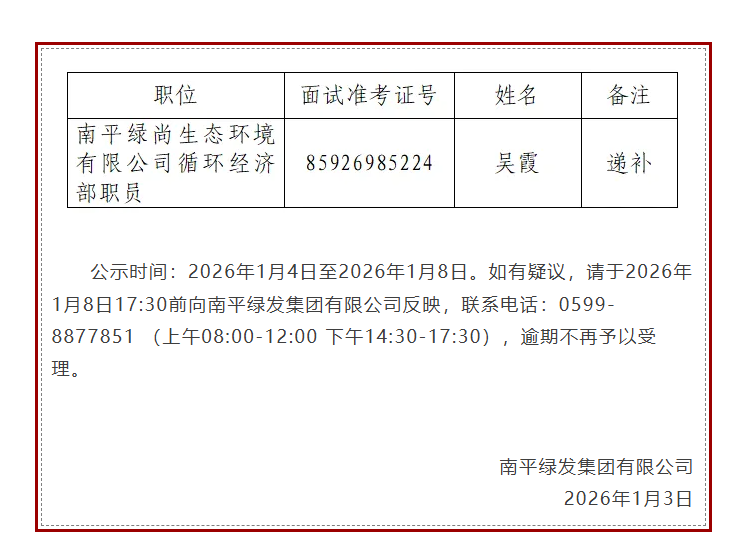 南平綠發集團有限公司公開招聘擬遞補聘用人員公示